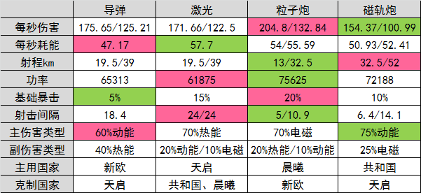 首先来看下表(斜杠左边代表格斗武器,右边代表狙击武器),表里列出了《第二银河》四种武器的主要参数,红色背景为突出属性,绿色背景为短板属性。基本上各个武器的特点就出来了。